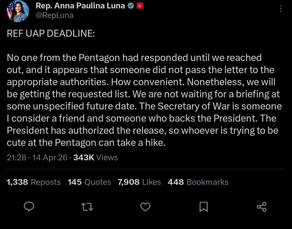 Following the Department of War's failure to release UAP footage as ordered, Representative Luna stated :